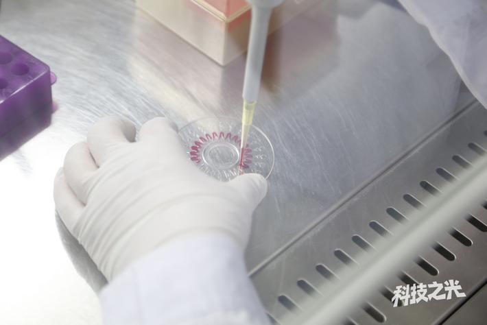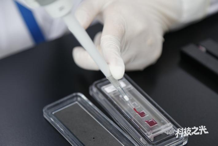 設(shè)計(jì)上經(jīng)過(guò)不斷優(yōu)化的碟式芯片,僅用微量樣本就可一次并行完成多個(gè)指標(biāo)的檢測(cè),圖為樣本被注入到芯片中間部位的聯(lián)通管道中。