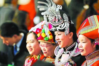 5日,第十二屆全國人民代表大會第三次會議在北京人民大會堂開幕。圖為幾位盛裝參會的少數(shù)民族女代表。本報記者 戴冰攝?
