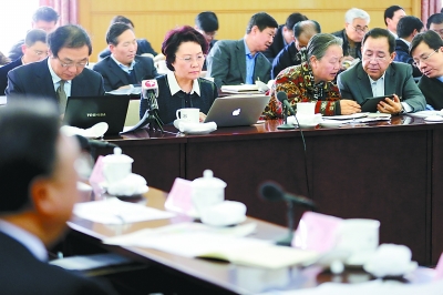 ?7日下午是全國政協(xié)十二屆三次會議委員提交提案截止時間,上午,在醫(yī)藥衛(wèi)生界聯(lián)組討論會場,幾名委員抓緊時間商議、潤色提案。本報記者 賈同軍攝?