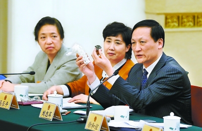 在北京代表團向媒體開放審議活動中,人大代表、北京大學第三醫(yī)院骨科主任劉忠軍發(fā)言時拿出了一截3D打印人體脊椎骨,并以此為例向在場的代表闡述自己的觀點,他認為,我國很多自己的科研成果因行政審批難導致走向市場困難,待審批批準后,國外同類產品已經大規(guī)模上市。本報記者 戴冰攝?